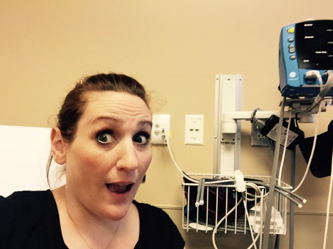 Nothing like waking up and running to get a echocardiogram of your heart in 13 degree weather. There was a mix up and my original appointment was cancelled, so last night I was told my new appointment was at 8:30. Unfortunately, I didn’t realize the location was changed.  The good thing is that everything is in the same place.  So I just had to go down a few flights and I was good to go.  The heart echo was no big deal.  Some cold jelly and a few beeps and I was on my way.  Next we had a few hours to kill so I went across the street to the other building (thank God for enclosed walking bridges) to get the chest X-ray that I was supposed to have the night before. This was by far the worst thing so far because the wait was nearly an hour and I was right in the middle of watching Property Virgins when I was called back for my 30 second X-ray.  Now I will NEVER know which house they chose.  I really hope it was the one with the shorter commute. Anyway.  We ran over to thecafeteria  next to kill some time before my vein check.  The most perplexing thing about the vein check was the name.  There was no checking of veins… It was more like harvest orientation.  I even got to see a very nice man getting his stem cells harvested.   This picture says it all.  My face had makeup blown all over it and let’s not even talk about the hair.