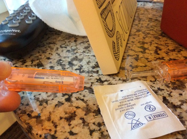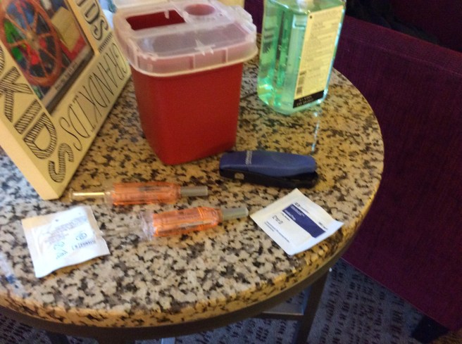 I thankfully brought my own needle cutter, alcohol pads and travel sharp container as they weren’t supplied with the needles and I wouldn’t have remembered to buy they when I picked up the prescription…. I mean it’s not like the neuprogen retails for nearly $10k or anything… Oh wait. Also, coworkers… Please ignore the competitors alcohol pads… They came free with the copaxone. Lol