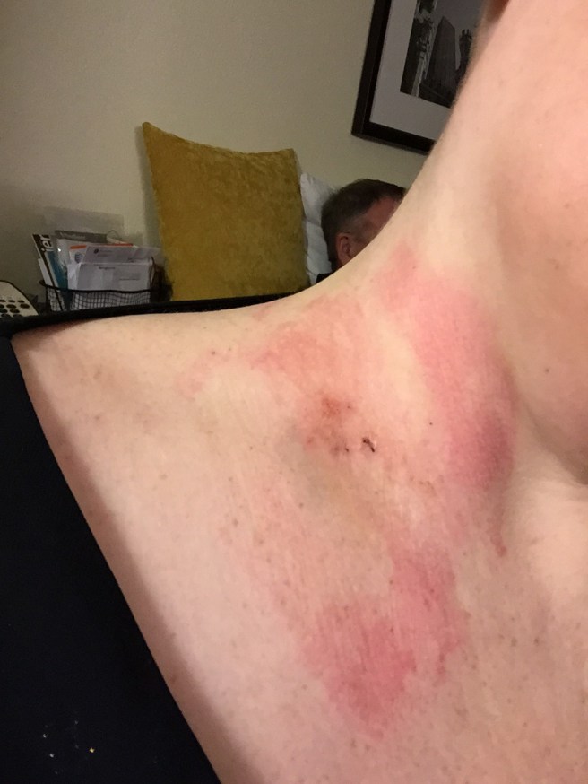 All day I have been DYING to take this bandage off. I had to wait 24 hours and I did it. I must say, the scar/cut is anticlimactic, but I think I may have been allergic to the tape. It’s been hurting and itching so bad, I mentioned this to Katlyn when she called today and she said they use the same tape for picc lines so we have to remember to mention it. Ok, get ready to judge for yourself. This is my pre-shower incision picture: