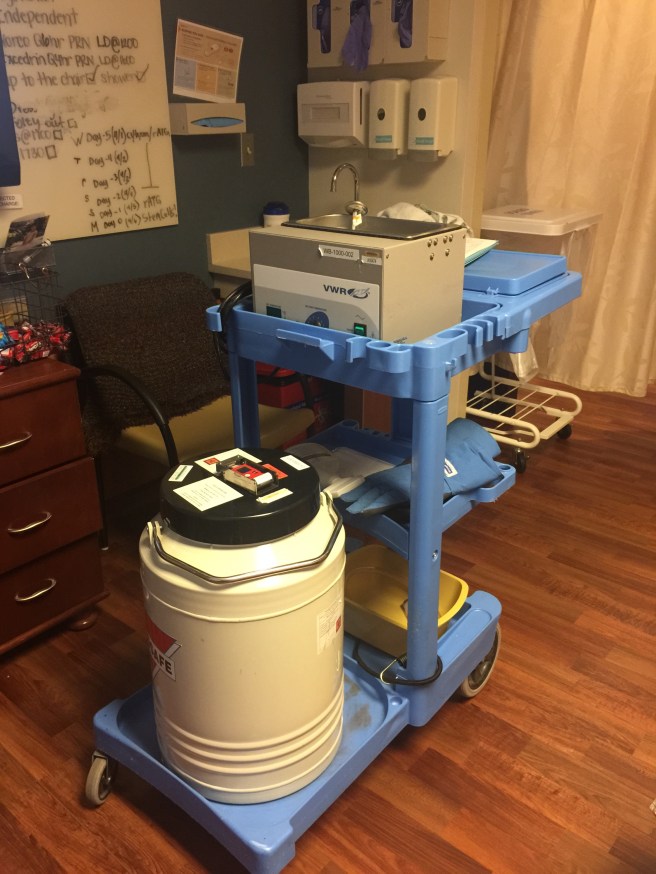 No Chemo – No Cure Remission! It’s all done folks!   I am on my way to a remission with God’s help.  We talk a lot with Kaitlyn while getting my transplant and she was helping everyone to understand the thing that will hopefully knock my disease out is already done.  It was the chemo and rabbit that I have had for days.  Today’s birthday of stem cells is a way for me to heal faster.  Now,  I will be weak, tired,  need blood, platelets and it WILL be a long bumpy road,  but I’m well on my way.  I am on my road to a life where I can have hopes for a future again.   My MS damage is still there.  I will still flare from time to time if I get sick or run down,  but that is nothing compared to fear of the unknown.  I can’t thank everyone enough for the prayers and blessings that you have given me. Here are some Pics and video from the main event. Frozen stemmies Defrosting stemmies All ready